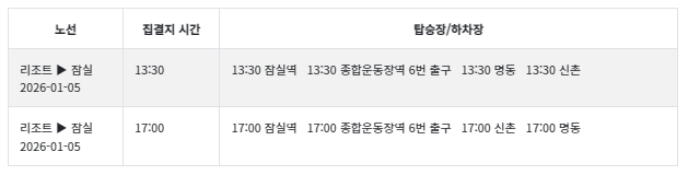 - 공식 예약 플랫폼 혹은 리조트 투어사 통합예약 페이지에서 날짜와 출발지는 선택해 예약하세요.(https://skibus.purplebus.co.kr/Hi/)