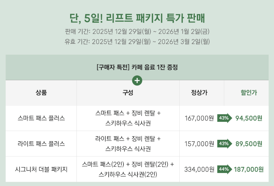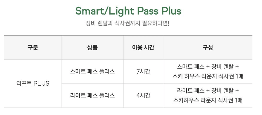 - 구성 : 리프트권 + 강습 + 장비 렌탈