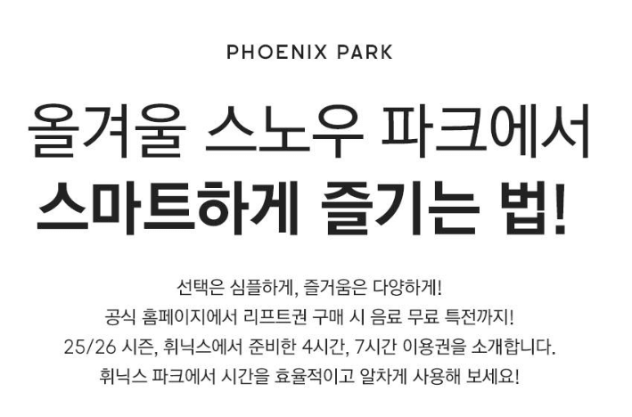 휘닉스파크 공식 홈페이지에서 사전예약 시 리프트권 할인이 적용됩니다. 성수기에는 예약 오픈 후 빠르게 마감되는 경우가 많아 접수 시작 시간에 맞춰 예약하는 것이 유리합니다.